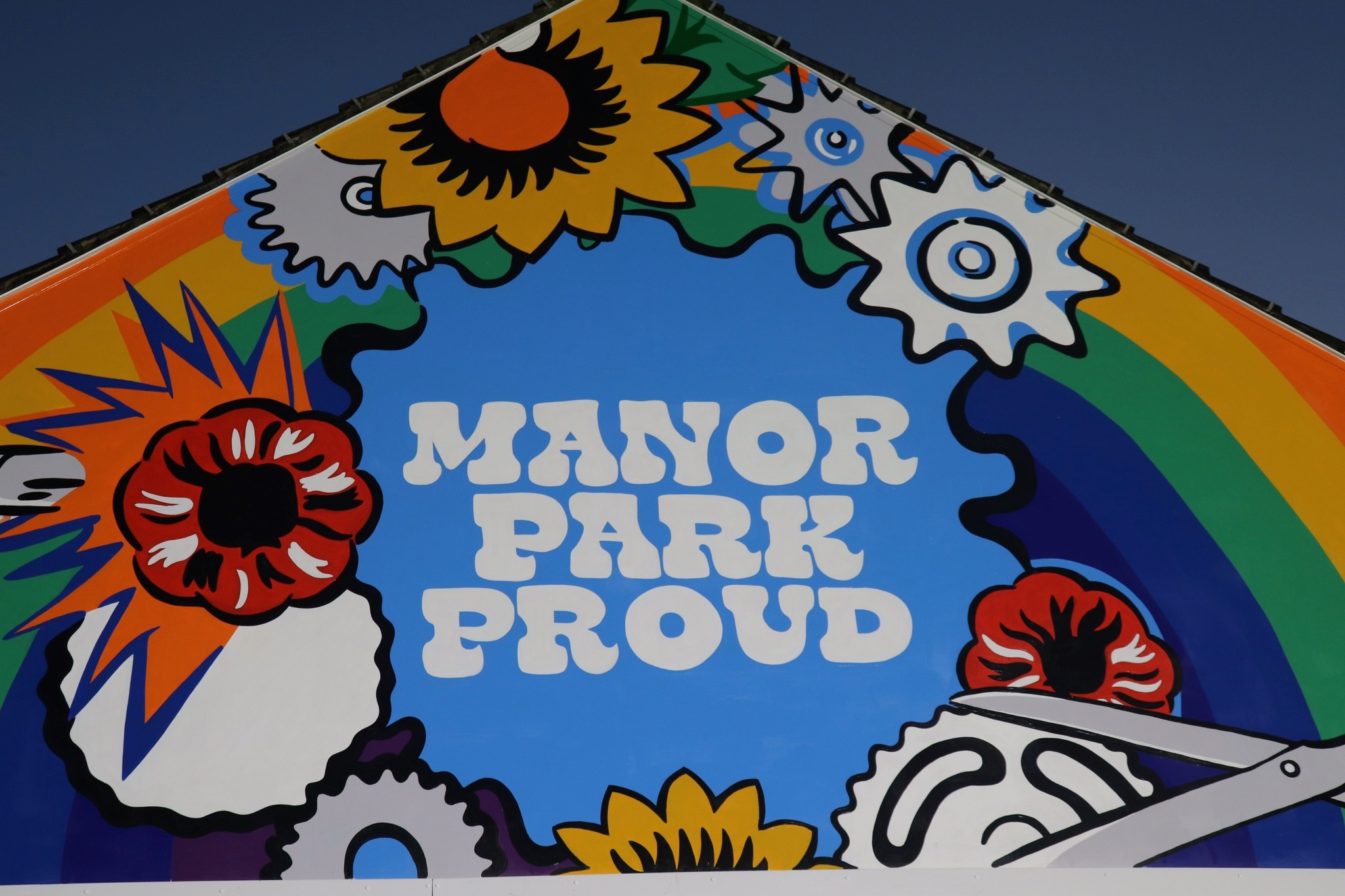 The Manor Park team were determined to create engaging, vibrant pieces of art that spoke to the character and history of the local area. To create the four separate designs (plus artworks on doorways on the high street itself) a series of consultations were held for each piece, from all sections of the community. A mural in Northern Avenue was inspired directly by lyrics written by young people as part of a project to discourage anti-social behaviour in the retail area, to help increase a sense of belonging and ownership in that cohort.