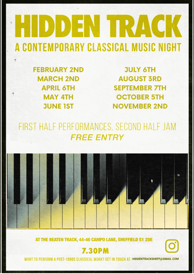 A monthly series dedicated to promoting and showcasing contemporary classical music in the heart of Sheffield. They will be hosting Hidden Track on the first Monday of every month at The Beaten Track.